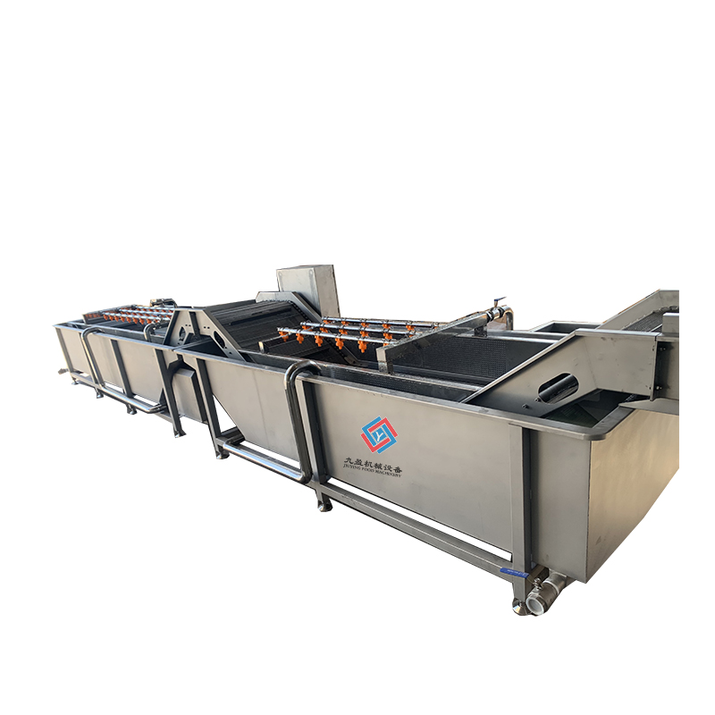 九盈毛菜加工生產(chǎn)線:蔬菜由暫存區(qū)進(jìn)入人工挑選段進(jìn)行初步挑選,其目的為除黃葉、爛葉、等不良品;初選后由人工投料,放入自動進(jìn)入提升機(jī)鼓泡清洗機(jī)進(jìn)行粗洗,在此過程中經(jīng)過鼓泡、噴淋、沖浪等多次清洗;粗洗后的蔬菜由整條連接的刮板帶動前行自動進(jìn)入二次清洗(精洗),同樣經(jīng)過鼓泡、噴淋、沖浪、等多次清洗與殺菌,水箱內(nèi)安裝有臭氧殺菌裝置,可同時(shí)清洗并進(jìn)行殺菌。該清洗設(shè)備自帶循環(huán)水裝置,水箱內(nèi)部為循環(huán)水。水箱內(nèi)部安裝有自帶加水裝置,經(jīng)過精洗后的蔬菜連接清洗風(fēng)干機(jī)進(jìn)行風(fēng)干,進(jìn)入風(fēng)干機(jī)后,經(jīng)過多次吹干后,該設(shè)備可連接作業(yè)臺及時(shí)進(jìn)行包裝,保證清洗后的蔬菜干凈新鮮。